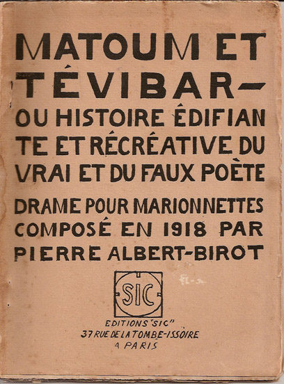 Pierre Albert-Birot, Matoum et Tévibar, ou l’histoire édifiante et récréative du vrai et du faux poète, Paris, SIC, 1919.