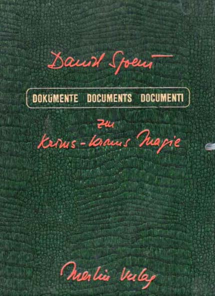 Daniel Spoerri, Dokumente / Documents / Documenti zu Krims Krams Magie, Hambourg Merlin Verlag 1971 27,8×20,6 cm, huit enveloppes reliées dans un portefeuille à ruban en simili cuir, titre en rouge or en couverture. Les enveloppes contiennent des contributions d’Emmett Williams, Daniel Spoerri, Pierre Alechinsky, Sybille Hentze.