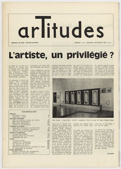Artitudes N°3, décembre 1971/janvier 1972, François Pluchart (dir.). L’artiste, un privilégié?