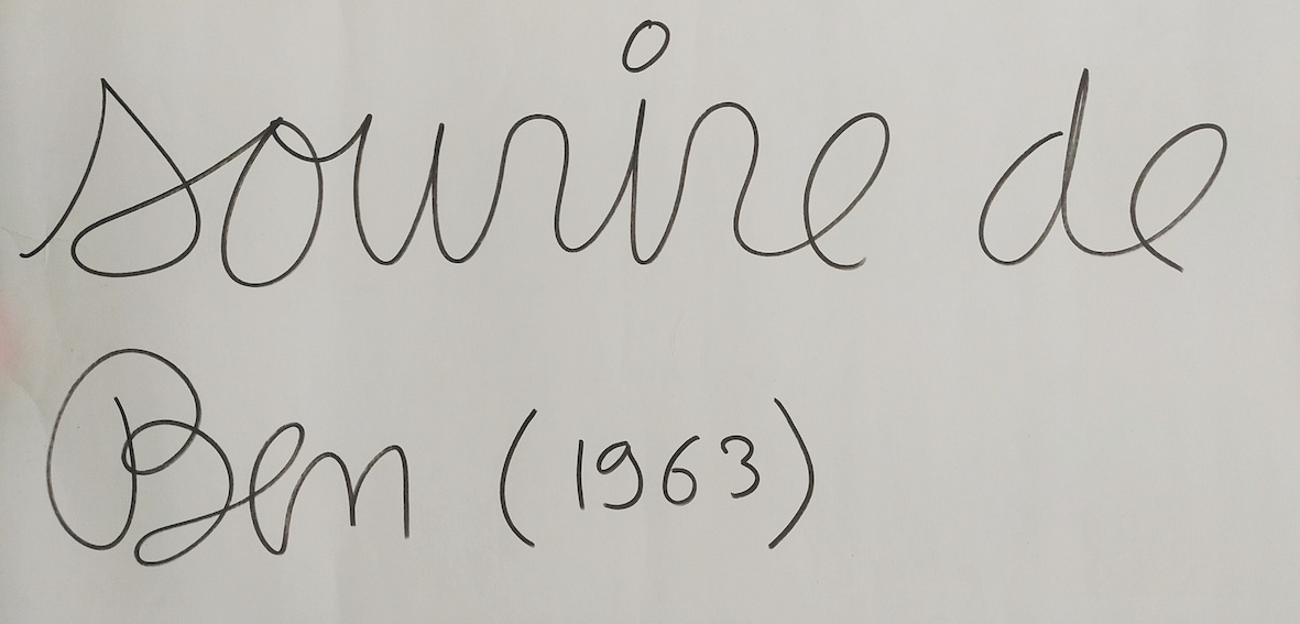Ben (Benjamin Vautier, dit), Sourire de Ben (1963), intervention au feutre au dos d’une matrice de couverture de catalogue, 38 x 86 cm.