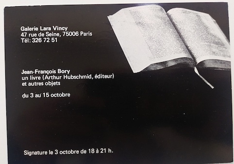 BORY, Jean-François,carton d’invitation de la galerie Lara Vincy pour la sortie du Livre Jean-François Bory, Paris-Zurich, Arthur Hubschmid, 1974.