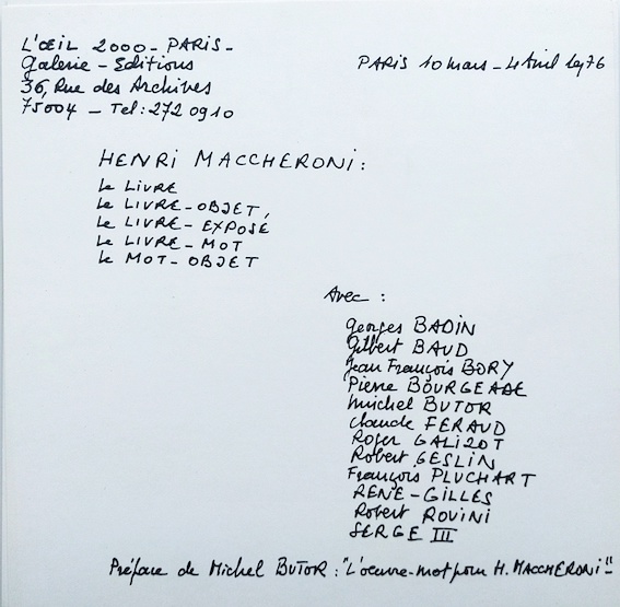 MACCHERONI, Henri, Fiches de travail pour Le livre, Paris, galerie L’œil 2000, 1976, préface de Michel Butor.