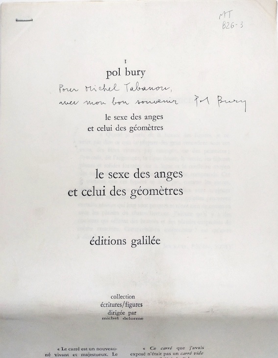 BURY, Pol, Caquète agrafé, de : Les sexe des anges et celui du géomètre, Paris, éditions galilée, 1976, ex dédicacé.