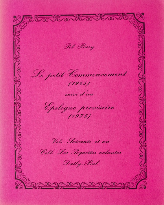 BURY, Pol, Le petit Commencement (1965) suivi d’un Epilogue provisoire (1976), La Louvières, Daily-Bul, coll. les roquettes volantes, 1975.