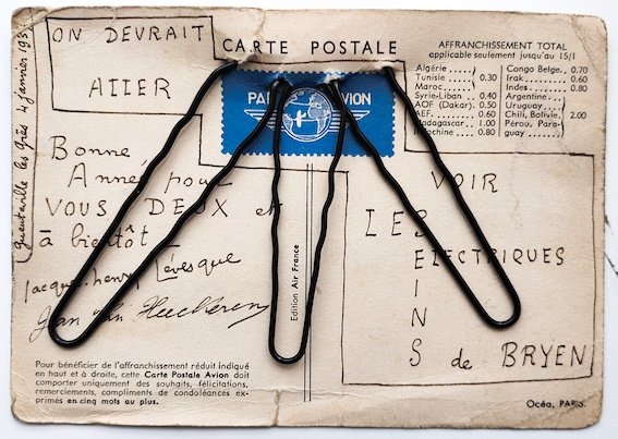 Camille Bryen, carte postale de Jean-Jacques Levesque et Jean Van Hucheny adressée à Camille Bryen, 4 janvier 1937, 2 épingles à cheveux sont enfoncées dans la carte postale. inv. n° CB O33 19