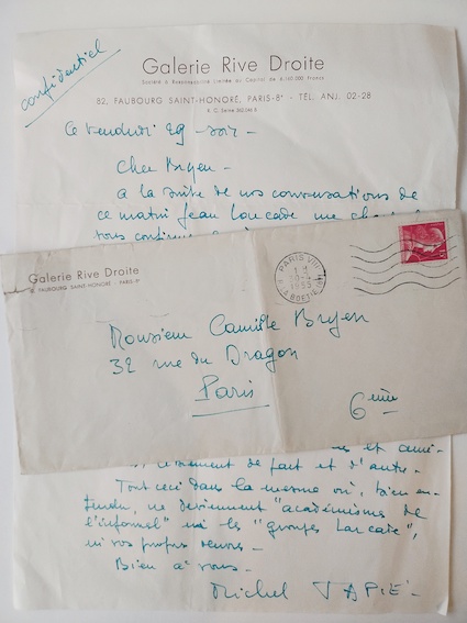 Tapié, Michel, lettre à Camille Bryen, 27 juin 1951, sur papier pelure, signé 20,5 x 26,6 cm. (avec enveloppe). inv. n° CB O38 19