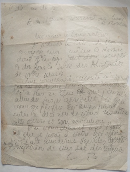 Bryen, Camille, lettre adressée au conservateur du musée de Bordeaux, non daté, crayon sur papier, 21 x 27 cm. inv. n° CB O34 19