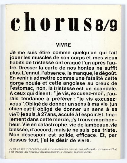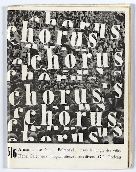 Revue Chorus N°5/6, 1970, agrafée sous couverture illustrée à rabats, (24,1 x 18,1 cm). Fondateur : Jean-Pierre Le Boul’ch, Rédacteurs : Pierre Tilman, Franck Venaille, Daniel Biga et Claude Delmas). ex. N°5. contient une sérigraphie d’Arman. Textes de Le Boul’ch, Le Gac, Boltanski, Godeau, Henri Calet et Fabrice Helion.