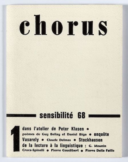 Revue Chorus N°1, automne 1968, agrafée sous couverture illustrée à rabats, (24,1 x 18,1 cm). Fondateur : Jean-Pierre Le Boul’ch, Rédacteurs : Pierre Tilman, Franck Venaille, Daniel Biga et Claude Delmas). ex. N°26, signé par Bellay et Biga. contient une œuvre de Peter Klasen signée. Peter Klasen, Guy Bellay et Daniel Biga, Vasarely, Claude Delmas, Stockhausen, G. Mounin, Croce-Spinelli, Pierre Gaudibert, Pierre della Faille.