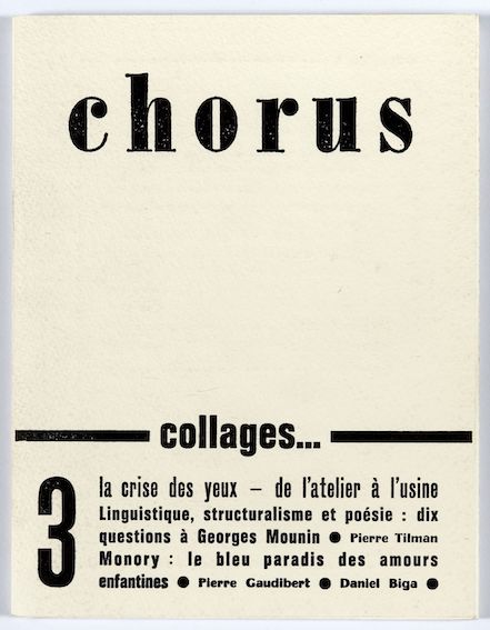 Revue Chorus N°3, automne 1969, agrafée sous couverture illustrée à rabats, (24,1 x 18,1 cm). Fondateur : Jean-Pierre Le Boul’ch, Rédacteurs : Pierre Tilman, Franck Venaille, Daniel Biga et Claude Delmas). ex. N°5. Contient une sérigraphie de Jacques Monory. contributions de : Daniel Biga, Pierre Tilman, Pierre Gaudibert, Frank Venaille, Jean-Pierre Le Boul’ch, Fabrice Hélion, pierre Mothange, Georges Mounin.