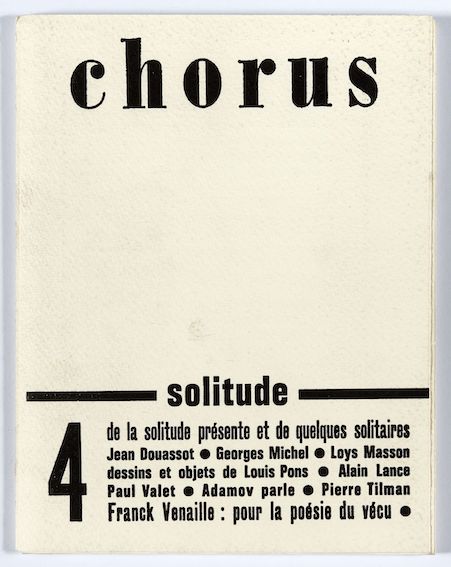 Revue Chorus N°4, printemps 1970, agrafée sous couverture illustrée à rabats, (24,1 x 18,1 cm). Fondateur : Jean-Pierre Le Boul’ch, Rédacteurs : Pierre Tilman, Franck Venaille, Daniel Biga et Claude Delmas). ex. N°3., comprenant une lithographie originale de Louis Pons. Poèmes de Alain Lance. Textes (enquète – solitude) de Pierre Della Faille, de Georges Michel, de Jean Douassot, de Loys Masson, de Arthur Adamov et de Paul Vatet. [Louis PONS] entretien avec Pierre Tilman. Textes de Bernard Gueit, de Philippe Chartron, de Franck Venaille « pour la poésie du vécu » et de Pierre Tilman.