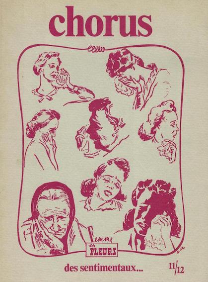 COLLECTIF, Revue Chorus N°11/12, des sentimentaux…, 1974, Fondateur : Jean-Pierre Le Boul’ch, Rédacteurs : Pierre Tilman, Franck Venaille, Daniel Biga et Claude Delmas). ex. non coupé. Contributions de : Pierre Tilman, Gérard Gasiorowski, Christian Boltanski, Annette Messager, Umberto Saban Jacques Monory, Jean Clair, Frank Venaille, Pierre Morhange, Lou Bernardo, Louis Pons, Jacques Donguy, Vianney Lacomeb, André Laude, Françoise Thieck, Claude Broussoulous, Hervé Télématique, Béatrice Parent-Cadéré. inv. n° CB 050 07