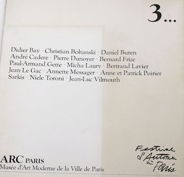 COLLECTIF, 3…, ARC, musée d’art moderne de la ville de Paris, festival d’automne, 1980. Didier Bay, Christian Boltanski, Daniel Buren, André Cadere, Pierre Dunoyer, Bernard Frise, Paul-Armand geste, Micha Laury, Bertrand Lavier, Jean Le Gac, Annette Messager, Anne et Patrick Poirier, Sarkis, Niele Toroni, Jean-Luc Vilmouth. inv. n° CB 040 07