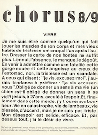 COLLECTIF, Revue Chorus N°8/9, 1972, Fondateur : Jean-Pierre Le Boul’ch, Rédacteurs : Pierre Tilman, Franck Venaille, Daniel Biga et Claude Delmas). ex. 25. contient une œuvre de César. contributions de : Jacques MONORY. Christian BOLTANSKI (album de photo de la famille D. – 1971). J.P. Le Boul’Ch « L’amour de la peinture ». Franck Venaille « FILMS ». Jean LE GAC. Daniel Biga « Écrites » et « Dossier sur la sexualité ». Textes de Jean Claude Liaudet « Emonctoire », de Françoise Thieck et de Rémi Esnault. 4 reproductions de HAMILTON. Poèmes de Pierre Tilman. Gérard TITUS CARMEL par Julien Montboron. Poèmes de Pierre Della Faille. CÉSAR. inv. n° CB 049 07