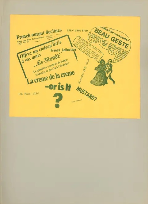 COLLECTIF, Revue SCHMUCK FRANÇAIS N°6. Beau Geste Press, Surrey. 1975. Jean-Clarence Lambert ed. Texte bilingue Anglais/Français. Broché, couverture souple ,carton gris, deux volumes montés tête-bêche par l’éditeur, une étiquette jaune imprimée en vert collée sur chaque plat. Textes imprimés en marron, orange, vert et noir sur papier crème. Illustré de photos et dessins. Dim: 212 x 290 mm. Ont participé à ce numéro: Robert Filliou, Jean le Gac, Christian Dotremont, Marcel Broodthaers, Christian Boltanski, Alain Fleischer, Jochen Gerz, Emilio Galli et Jean Clarence Lambert, Ben Vautier, Alin Anseeuw , Bernard Anseeuw, Liu Gazes, Henri Chopin, Noel Dolla, Alain Fleischer, Roland Flexner, Jochen Gerz, Paul Armand Gette, Gervais-Bernard Jassaud, Maurice Lemaître, Jean-Claude Moineau et Herve Wurz. inv. n° CB 051 07