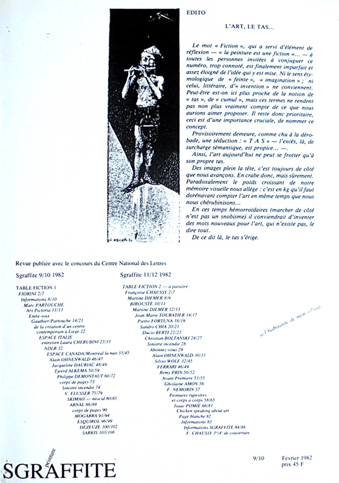 COLLECTIF, Sgraffite n°9/10, 1982. Contributions de : Marc Partouche, Laura Cherubini, Alain Ohnenwald, Jacqueline Dauriac, Tjeerd Alkema, Philippe Demontaut, V. Flusser, Skimao, Arnal, Mogarra, Esquirol, Dezeuze, Sarkis, Françoise Chaussy, Martine Diemer, Birouste, Jean-Marie Touratier, Pietro Fortuna, Sandro Chia, Ducio Berti, Christian Boltanski, Silvio Wolf, Remy Prin, Ghislaine Amon, F. Nemorin, Isaac Pomié. inv. n° CB 041 07