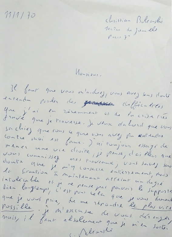 Christian Boltanski, fac-similé d’une lettre envoyée le 11 janvier 1970, 21 x 29,7 cm.