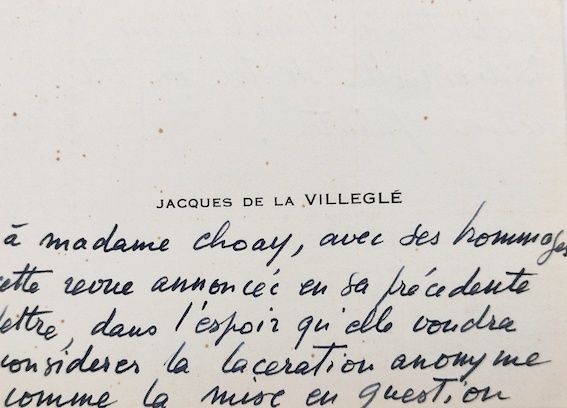 de la Villéglé, Jacques, petit mot sur carte de visite adressé à Madame de Choay, 9,4 x 7 cm.