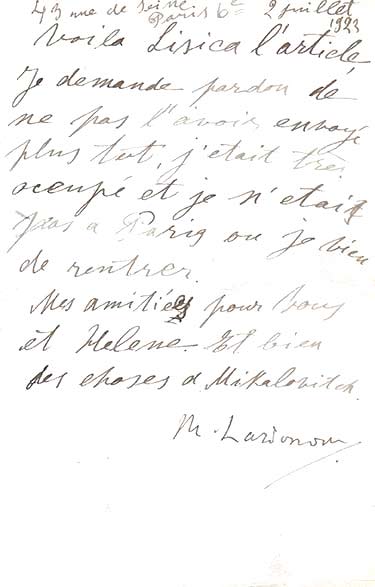 de Massot, Pierre, Pour insérer, note au stylo sur papier plié en deux, 11 x 17 cm.