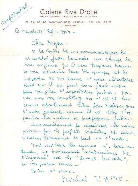 Tapié, Michel, lettre à Camille Bryen, 27 juin 1951, sur papier pelure, signé autre rose, 20,5 x 26,6 cm. (avec enveloppe).