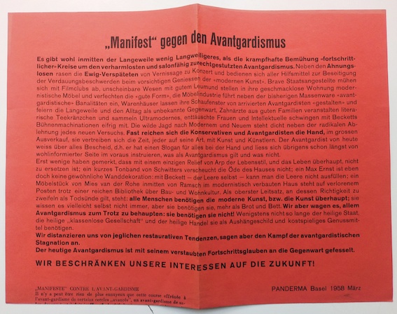Panderma (LASZLO, Carl), Manifest gegen den Avantgardismus, Basel, mars, 1958.