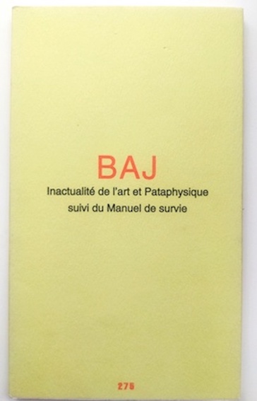 Baj, Enrico, Inactualité de l’art et Pataphysique suivi du Manuel de survie, Paris, éd. Jannink, 1998, ex. num. 122.