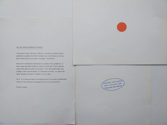 LASSUS, Bernard, Jeu des prolongements visuels, 1 page imp. sur papier blanc et 2 pages cartonnées imprimées, 1 avec un point rouge au centre, la seconde avec un tampon bleu au centre.