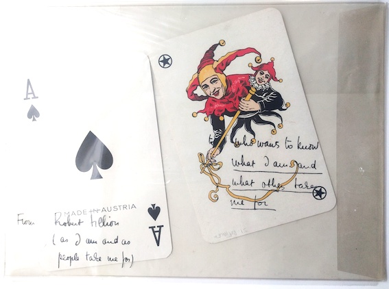 Robert Filliou, Joker, Deux cartes géantes du Joker et de l’as de pique dans une pochette plastique avec inscriptions sérigraphiées, éd. Galerie Art Intermedia, Cologne, 1969. inv. n° RF048 07