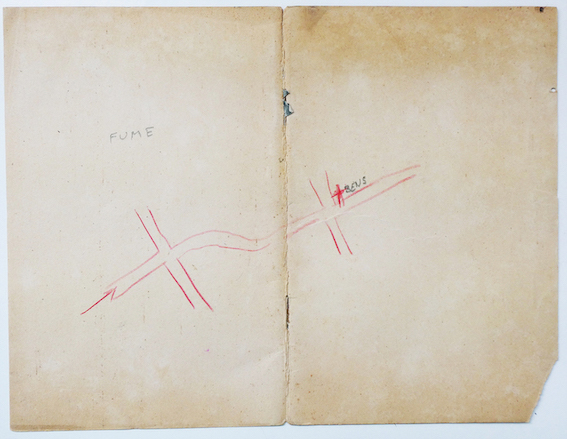 FILLIOU, Robert, Album de chiffre, interventions de Robert Filliou à la craie grasse, collage d’enveloppes, de photographies, de poèmes sur les 52 pages, 24 x 31,5 cm, signé. inv. n° RF 014 07