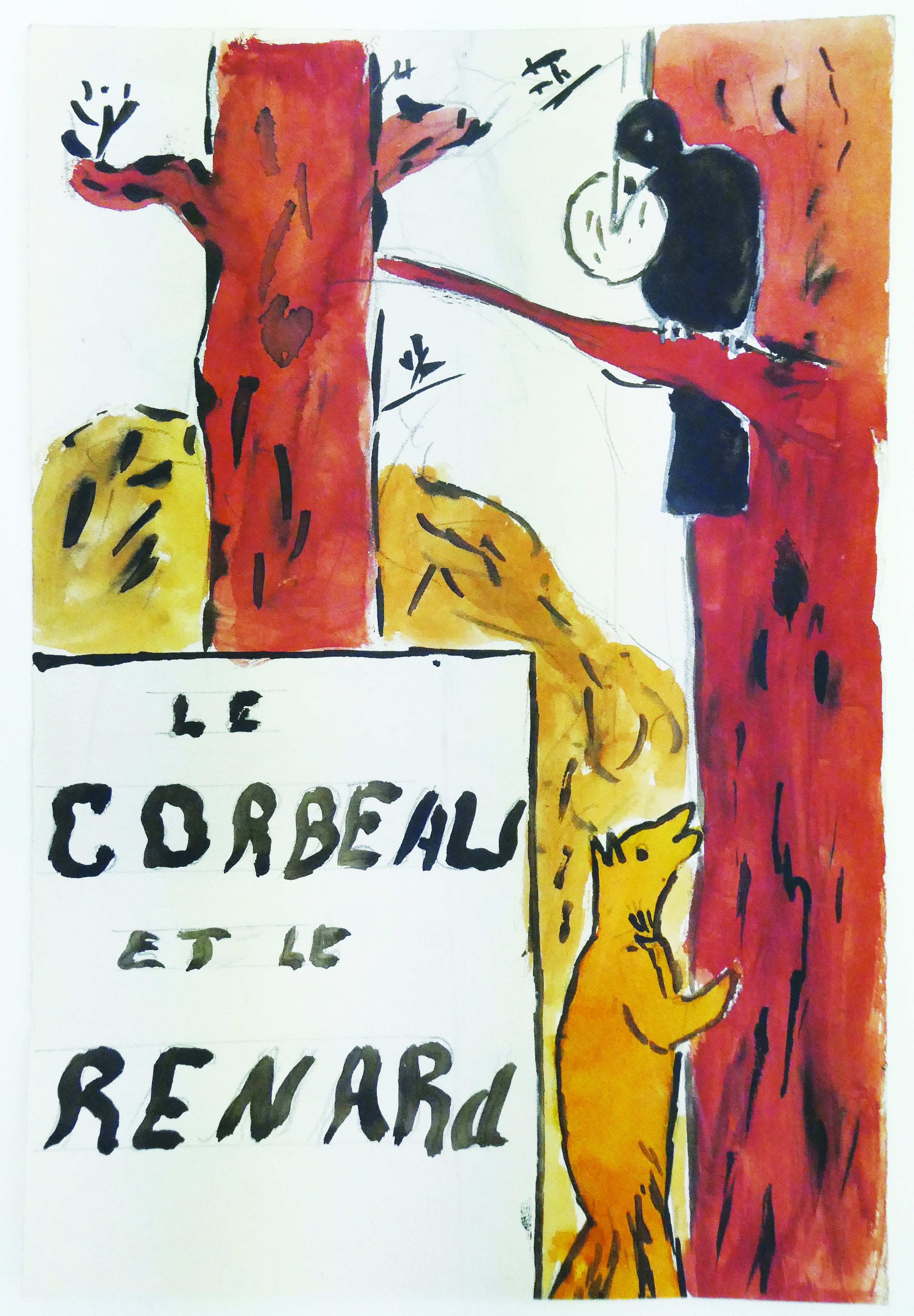 FILLIOU, Robert, Le corbeau et le renard, aquarelle sur papier, dessin recto, 16 x 24 cm. inv. n° RF 022 07