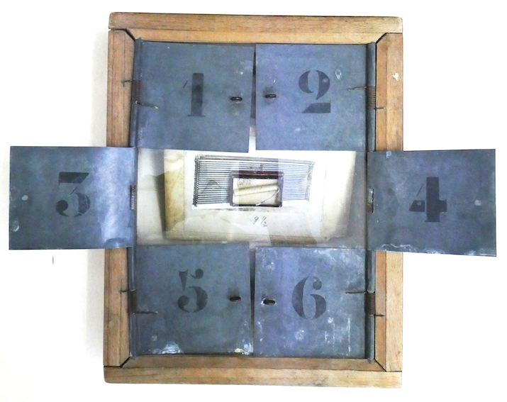 FILLIOU, Robert, Futilité, Pétard fixé dans une boîte collée sur une carte postale photographique, insérée dans le châssis d’un cadre avec plaque de verre dissimulée par 6 pièces en métal numérotées et articulées. 24 x 30 x 4 cm Signé au dos. inv. n° RF 018 07