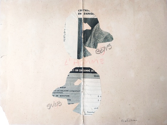 FILLIOU, Robert, sans titre, collages et ouvre boîte collé sur papier, 21 x 15 cm, signé, verso dessin au crayon, 1961-62. inv. n° RF 026 07