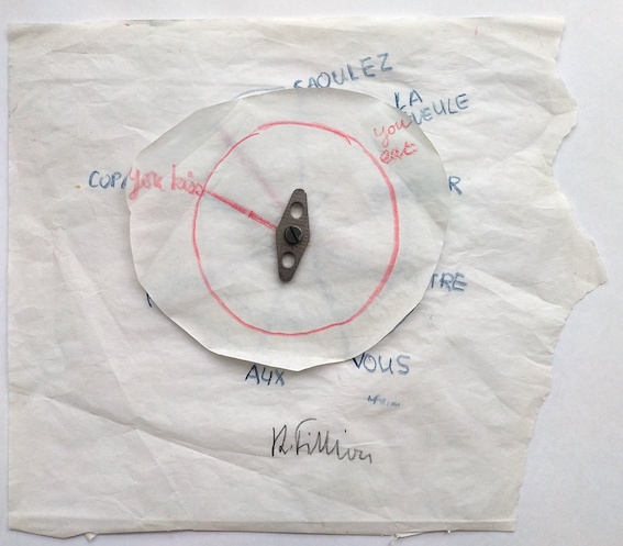 FILLIOU, Robert, esquisse pour Danse Poème aléatoire collectif, crayon et métal sur papier, 24 x 20 cm.