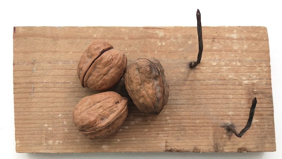 FILLIOU, Robert, trois noix, noix et clous sur bois, 1961, 20 x 10 x 7 cm, signé. inv. n° RF 006 07