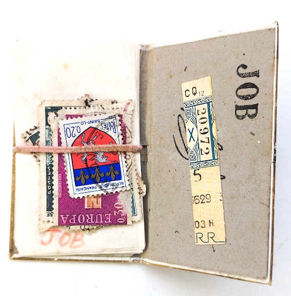 FILLIOU, Robert,Job, timbre, crayon et billet de la ratp sur paquet de papier à cigarettes, 1962. inv. n° RF 012 07