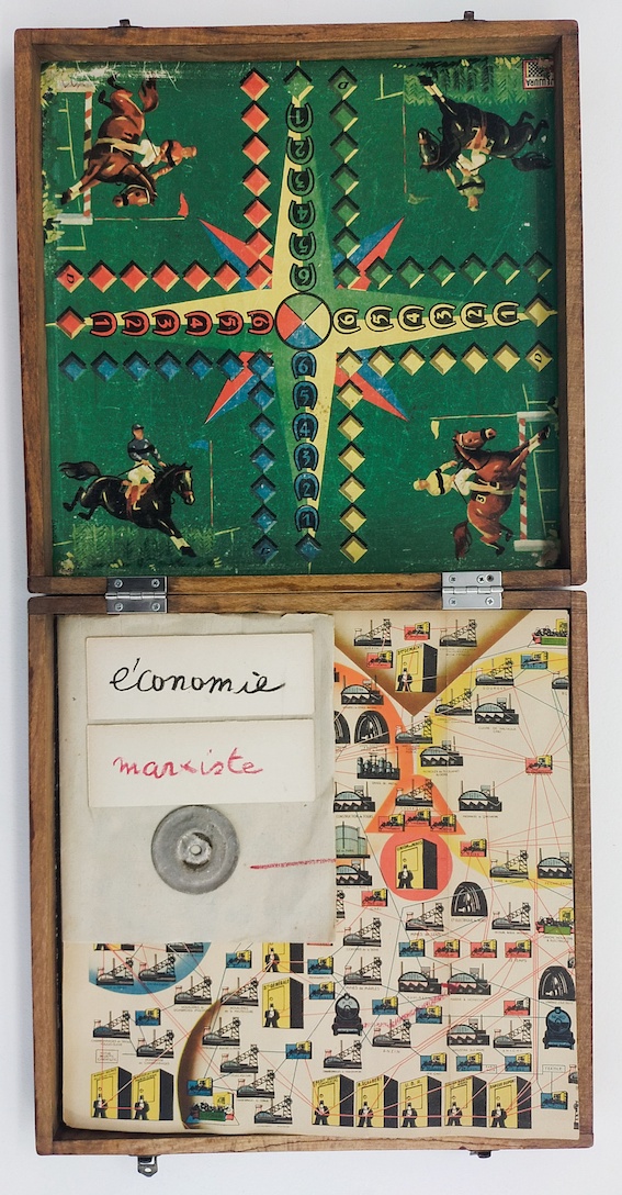 FILLIOU, Robert, Jeux Multiples, trois diagrammes issues des deux cents familles, rondelle en métal, craie grasse et papier dans boîte de jeux en bois, 1962, 33 x 33 x 6 cm, signé. inv. n° RF 017 07