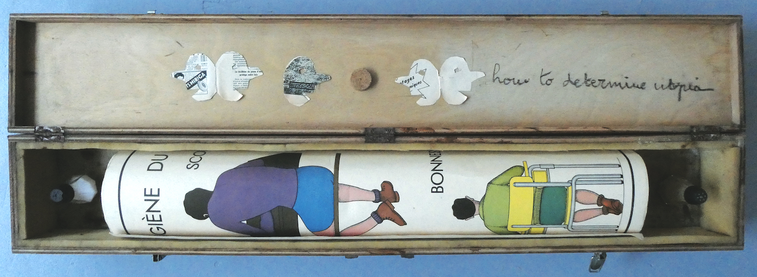 FILLIOU, Robert, How to Determine Utopia, Boîte contenant une carte anatomique scolaire, une salière, un poivrier, cinq silhouettes découpées, signé sur le côté droit, 105 x 34 x 10 cm. inv. n° RF 019 07
