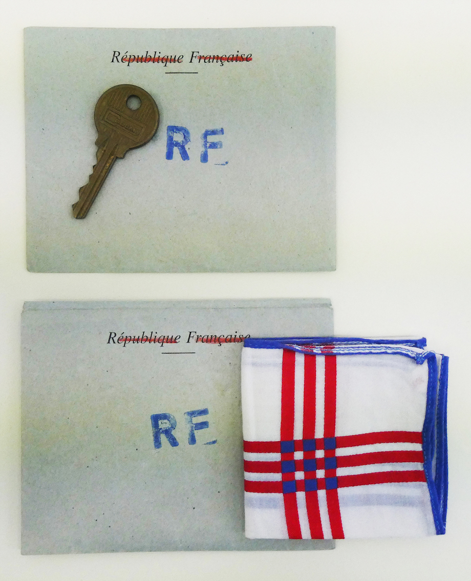 FILLIOU, Robert, RF, deux enveloppes de vote, clé et mouchoir, 12 x 10 cm chaque, signé. inv. n° RF 029 07