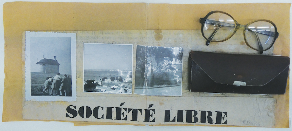 FILLIOU, Robert, Société libre, étui à lunettes, lunettes, trois photographies collées sur un journal du 19ème siècle collé sur du papier d’emballage 46,5 x 22,5 x 3 cm, signé. inv. n° RF 020 07