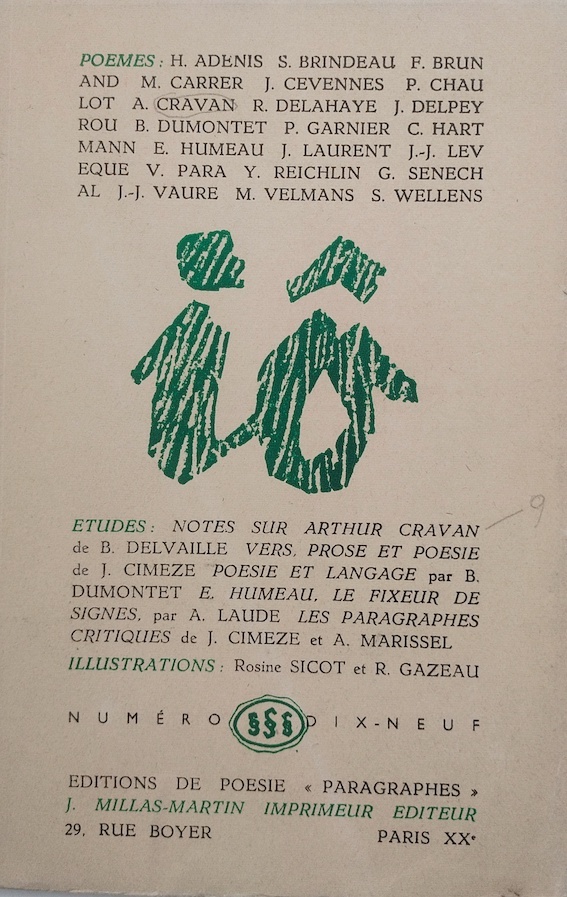 Iô N°19, Cahiers de poésies, Paris. Contributions de : Jean Cimeze, Paul Chaulot, jacques cevennes, Serge Brindeau, Robert Delahaye, Jacques Delpeyrou, B. Delvaille, Arthur Cravan, Pierre Garnier, Georges Senechal, Jean-Jacques maure, Michel Velmans, Yvonne Reichlin, Jean Laurent, Marcel carrer, André Laude, Edmond Humeau, Claude Hartmann, Jean-Jacques Leveque, Serge Wellens, Félix Brunand, B. Dumontet, Henri Adenis, Vincent Para, ilas de Rosine Sicot et Roger Gazeau.