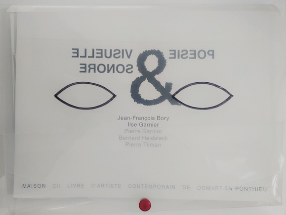Poésie visuelle & sonore, quatrième ouvrage de la collection « le livre des livres », Maison de livre d’art contemporain, Domart-en-Ponthieu, 1995, ex. 274. contient : Deux tirages sur Terphane de Jean-François Bory, un dépliant de Ilse Garnier, Une enveloppe de pierre Garnier, Deux tirages de Bernard Heidsieck, une affiche de Pierre Tilman et neuf fiches bristols sous pochette, le tout dans une boîte transparente.