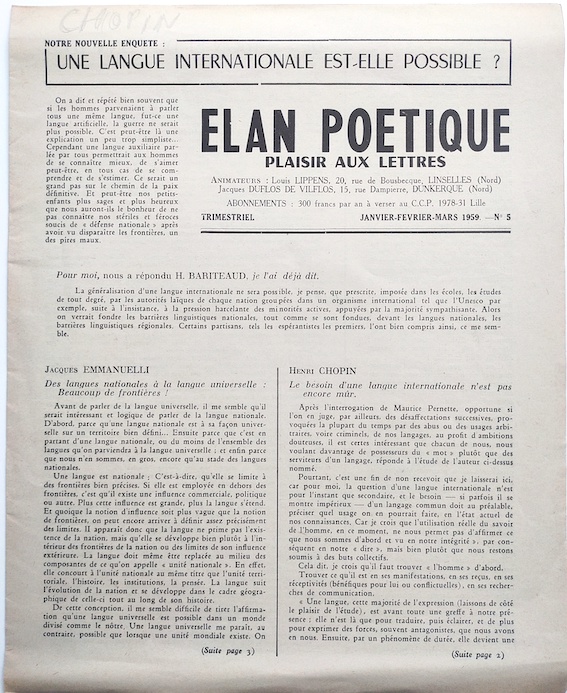 Chopin, Henri, Elan Poétique, N°5, mars 1959. textes de Jacques Emmanuelli, Henri Chopin, Louis Lippens, Reva Remy, Maurice Pernette, Jean Rivet, Jean Souvenance.