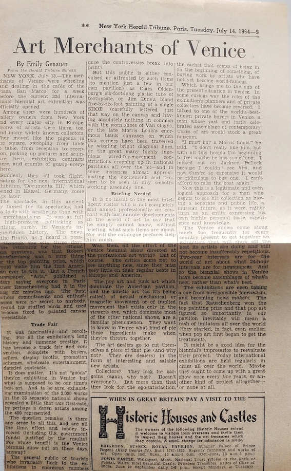 Emily Genauer, Art Merchants of Venice, New york Herald Tribune, Paris, 14 juillet 1964.
