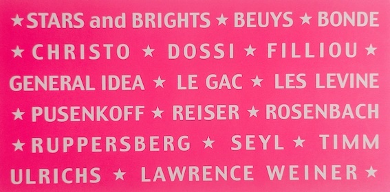 carton d’invitation Stars and Brights, Stuttgart, Brigitte March Galerie, 2002. Beuys, Bonde, Christo, Dossi, Filliou, General Idea, Le Gac, Les Levine, Pusenkoff, Reiser, Rosenbach, Ruppensberg, Seil, Timm Ulrichs, Lawrence Weiner.