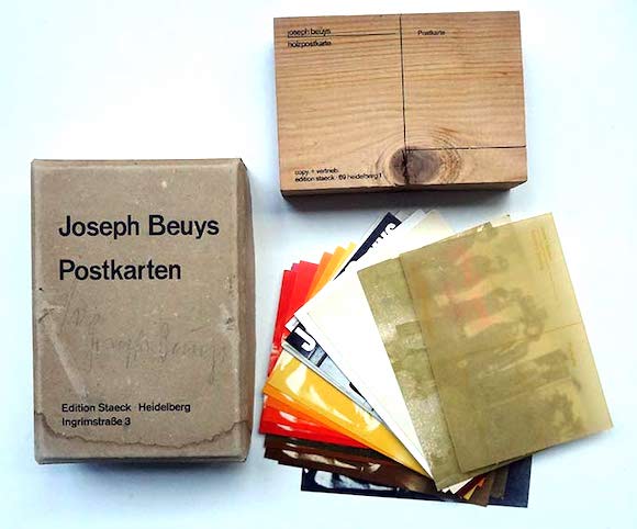 Joseph Beuys, Postkarten, Heidelberg, Edition Staeck, 1974. Contient une carte postale en bois, une en vinyle, et trente cartes postale.