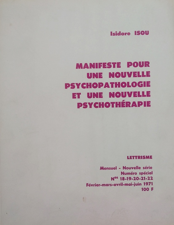 Isou, Isidore, Manifeste pour une nouvelle psychopathologie et une nouvelle psychothérapie, Lettrisme, 1971.