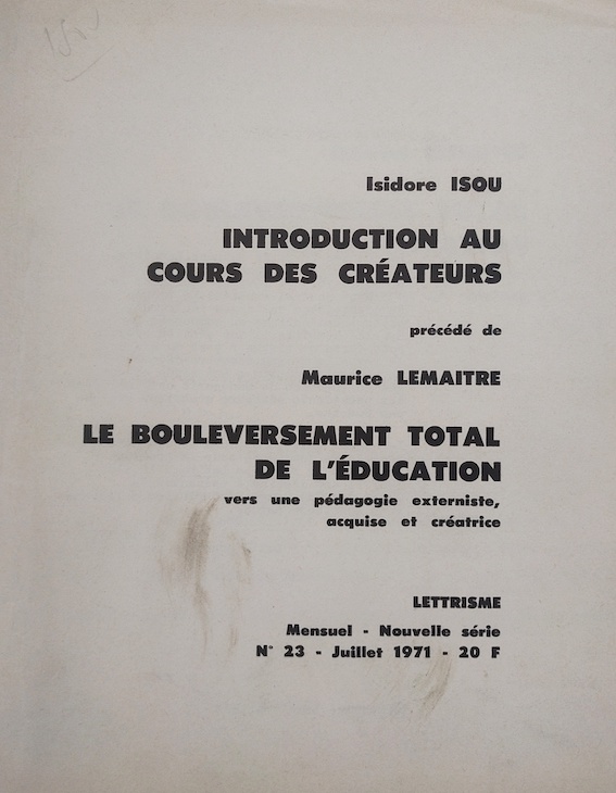 Isou, Isidore, Introduction au cours des créateurs, précédé du Bouleversement total de l’éducation, Lettrisme, 1971.