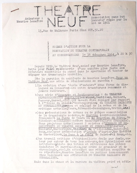 Lemaître, Maurice, Théâtre neuf, soirée d’action pour la rénovation du théâtre contemporain au conservatoire, Paris 2 pages tapées à la machine, agrafées.