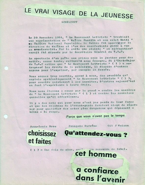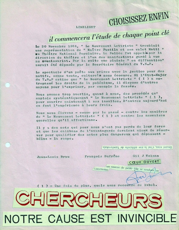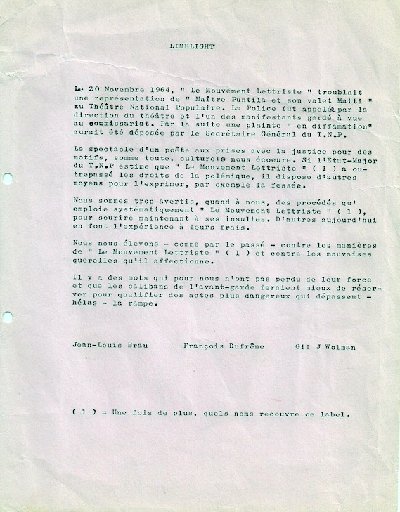 Deuxième Internationale Lettriste, Limelight, Un feuillet ronéoté 26,9 x 20,9 cm, impression en noir sur papier blanc au recto et au verso. A propos d une manifestation lettriste au TNP le 20 novembre 1964, signé par Jean-Louis Brau, François Dufrêne, Gil. J. Wolman.