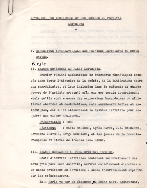 Lettrisme, notes sur les techniques et le œuvres du festival Lettriste, 7 pages ronéotypées avec quelques intervention au stylo. Isidore Isou, Maria Casares, Agnès Capri, J.L. Barrault, Germaine Montero, Serge Reggiani.